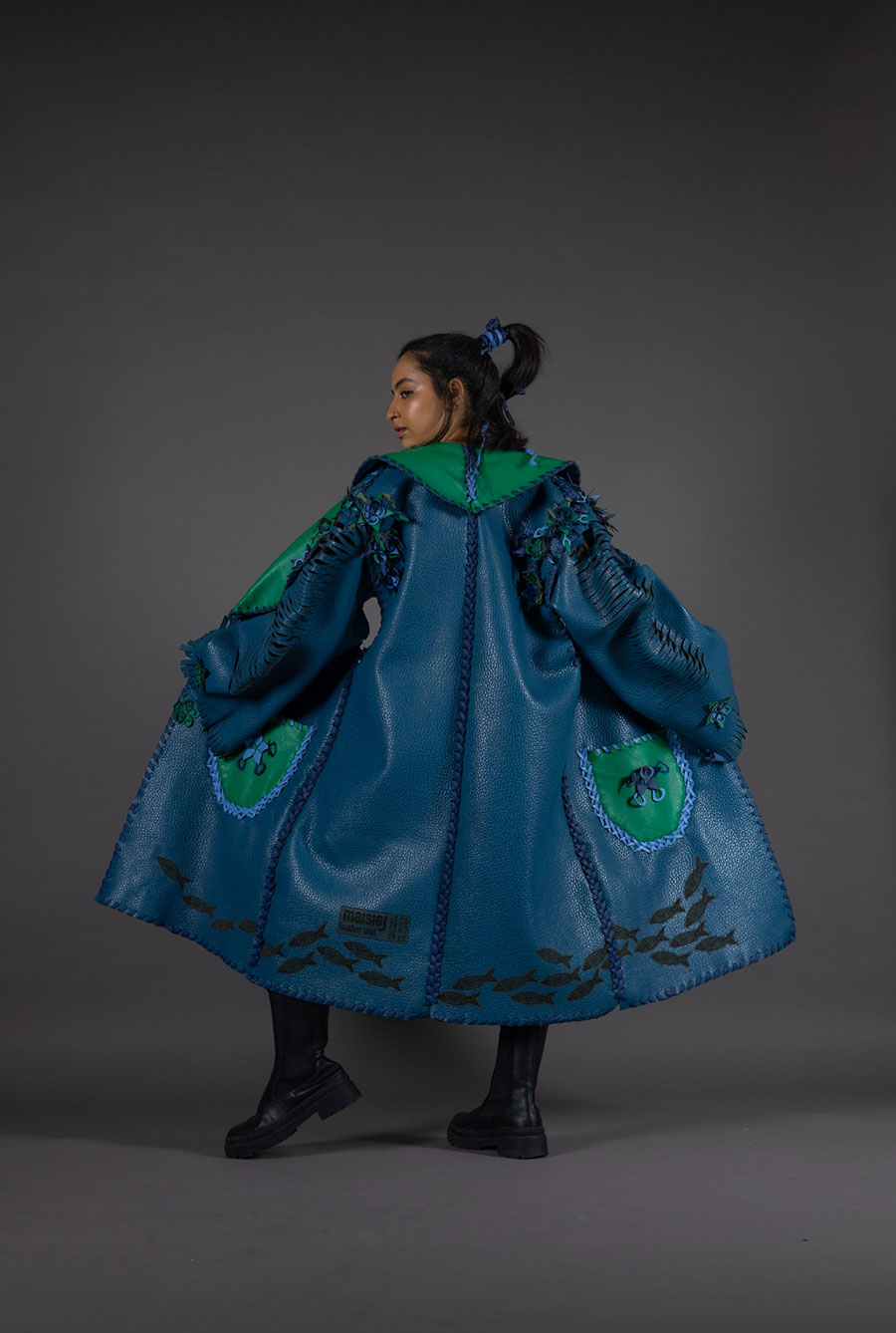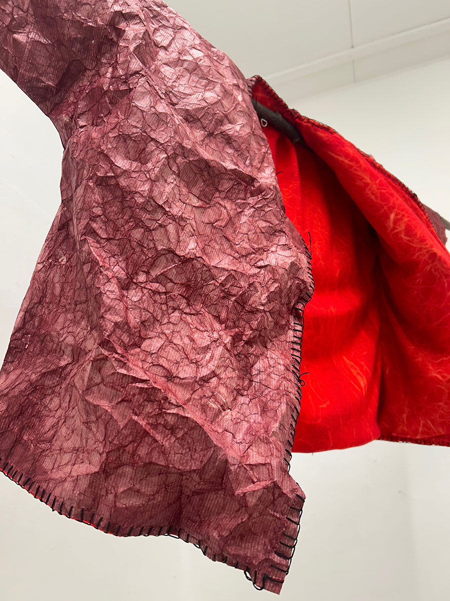 The judging panel loved the way in which Maisie merged technology with artisanal craftsmanship, beginning with hand-cut lino prints – an inherently tactile and personal process – before digitising and rastering them onto leather. How she engineered three-dimensional textiles through interlocking cut systems slotted together, without adhesives or stitching, was very exciting, and expanded construction possibilities in a decorative manner. Maisie’s mono-material approach extended to prototype garment assembly, eliminating stitching in favour of leather weaving techniques. Her aim to develop a ‘no-sew’ method, ensuring easy disassembly and recyclability at the garment’s end of life was admirable.