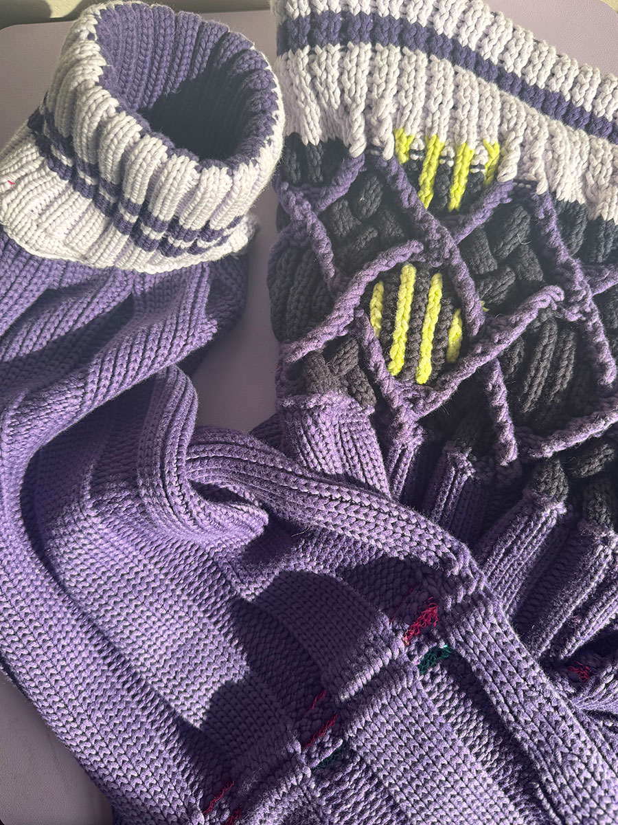 Oliver’s utilisation of innovative hand techniques, alongside Create+Stoll programming to devise fabrics suitable for sportswear, together with his chosen immersive colour palette, were eye-catching. We felt that Oliver’s work had a unique identity and loved his prototype cycling one pieces, joggers, jumpers, boxing gloves, and racket bag designs.